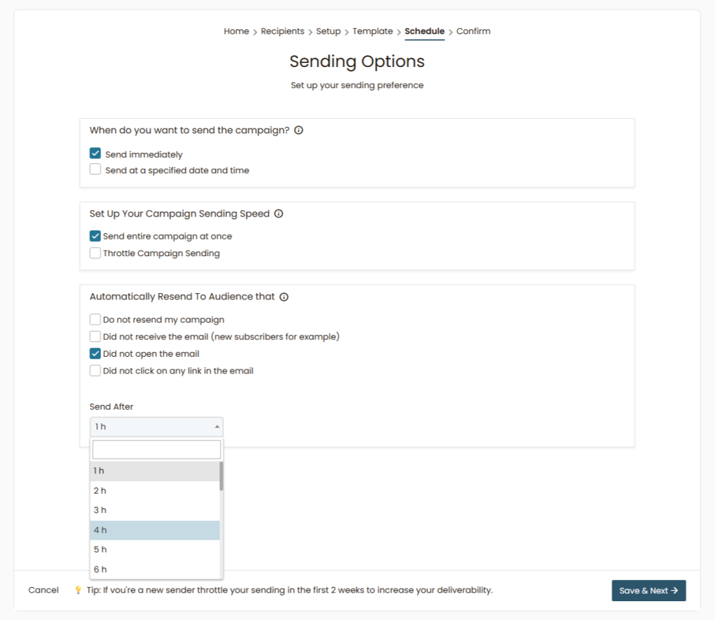 - Throttle if Needed: If you are a new sender, remember the tip at the bottom of the page: Throttle your sending during the first 2 weeks to safely build up that reputation.