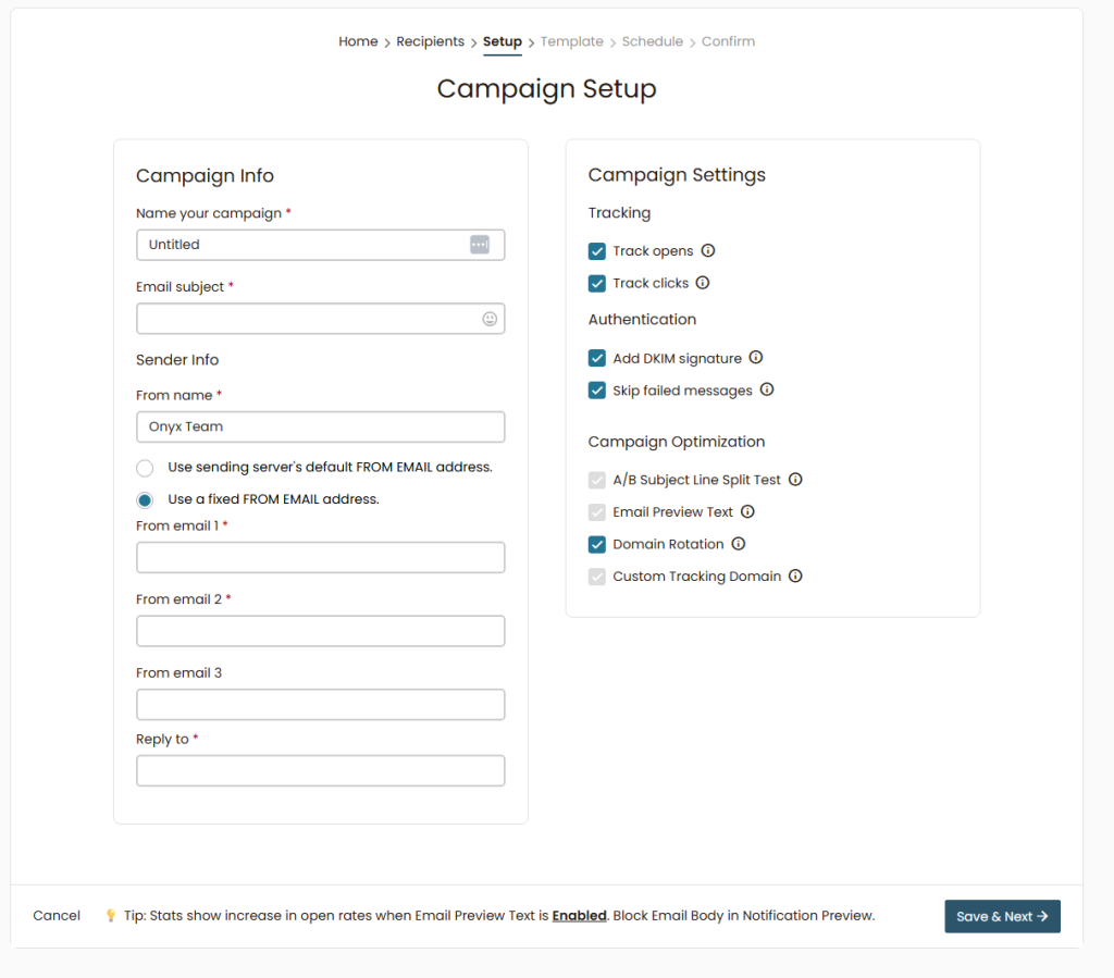 - Use Verified Domains: Ensure all email addresses used in rotation belong to domains that are fully verified (SPF, DKIM, DMARC) in your SendOnyx account.