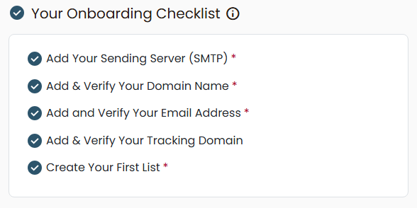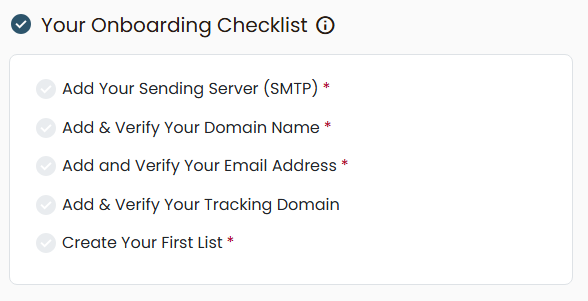 Before sending campaigns at scale, Send Onyx requires a few essential setup steps. The Onboarding Checklist ensures your account is configured correctly for deliverability, tracking, and compliance.
